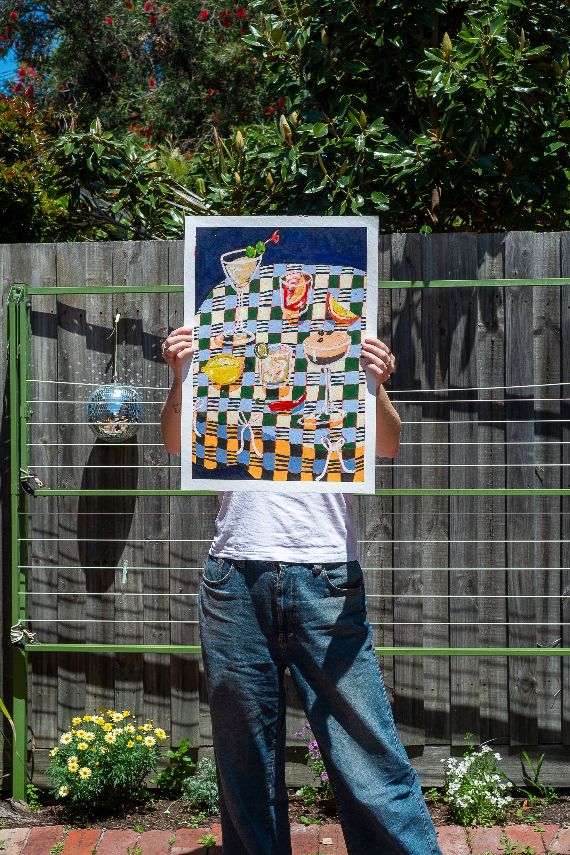 Created using acrylic paint on premium 100% cotton paper, this piece is part of my ‘Table Textures’ collection - a series celebrating the playful, pattern-filled world of tablescapes. Each artwork features a unique tablecloth design, honouring my love of textiles, colour, and the stories wrapped up in the surfaces we gather around. As always, each piece is rich in vibrancy, texture, and intuitive layering from start to finish.
