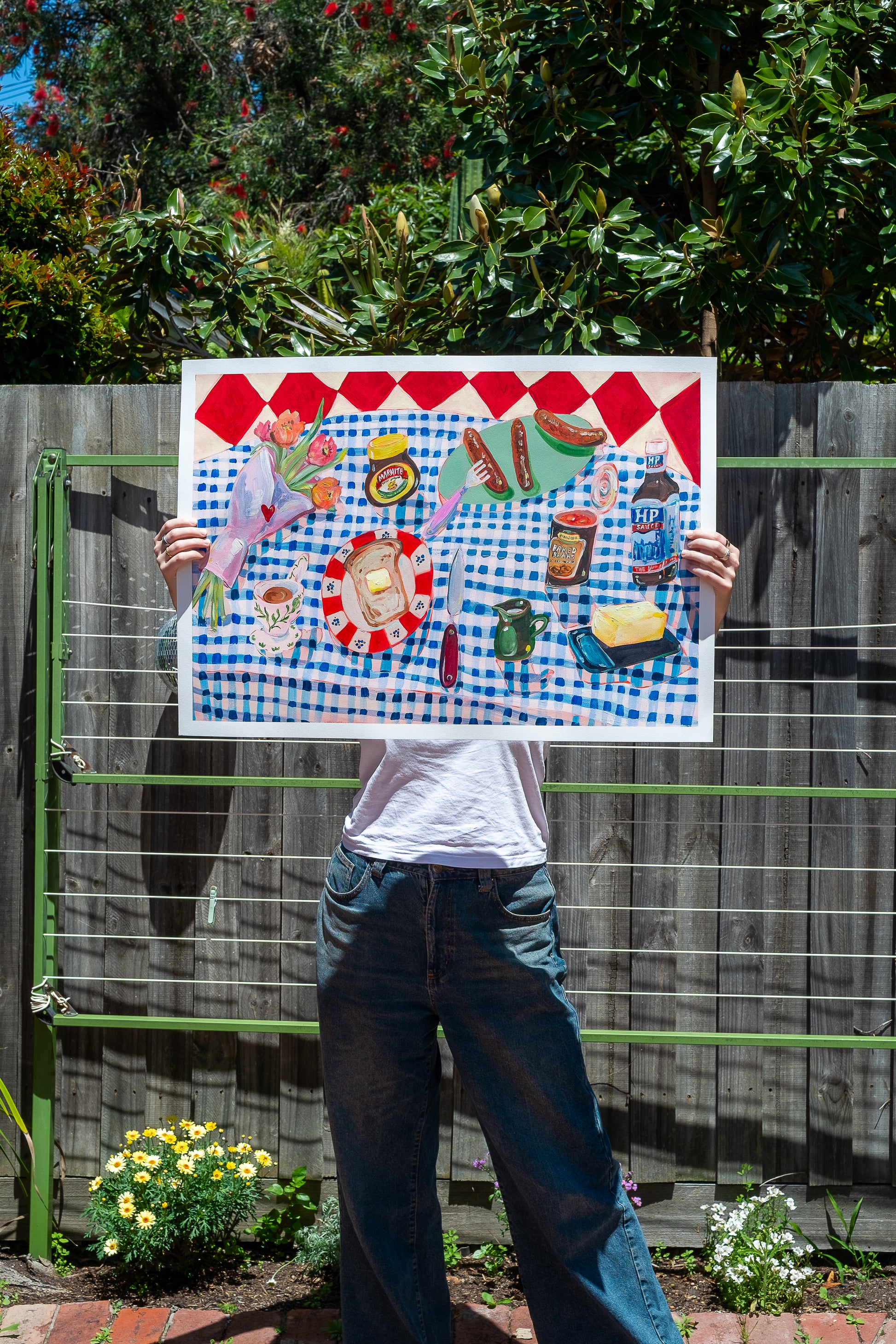 Created using acrylic paint on premium 100% cotton paper, this piece is part of my ‘Table Textures’ collection - a series celebrating the playful, pattern-filled world of tablescapes. Each artwork features a unique tablecloth design, honouring my love of textiles, colour, and the stories wrapped up in the surfaces we gather around. As always, each piece is rich in vibrancy, texture, and intuitive layering from start to finish.